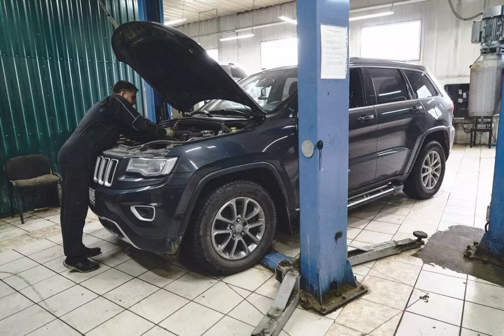 Сначала загоните Grand Cherokee в рабочую зону. Здесь не нужен подъемник, все работы выполняются с земли.