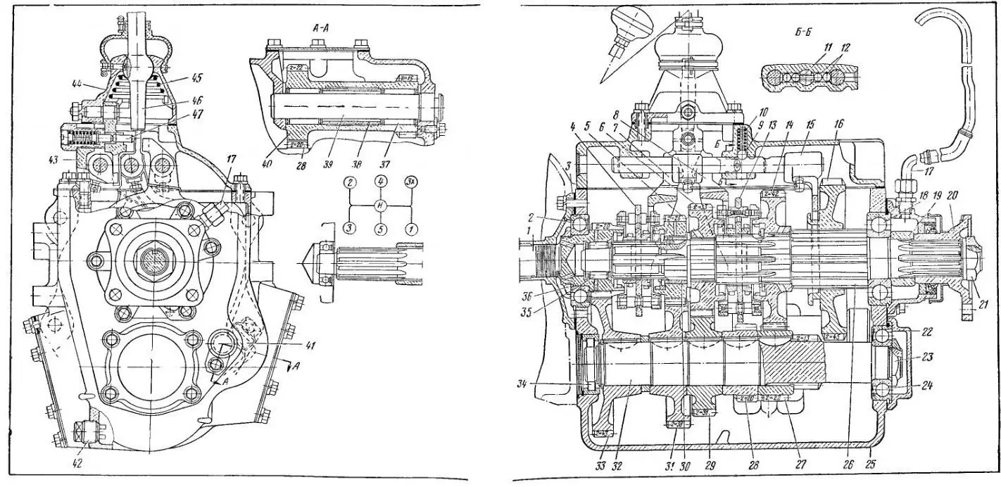1 — коленчатый вал; 2, 18, 24, 34, 35 и 37 — подшипники; 3 — крышка подшипника карданного вала; 4 — синхронизатор четвертой и пятой передач; 5 и 31 — звездочки четвертой передачи; 6 и 29 — зубчатые колеса третьей передачи; 7 — вилка переключения четвертой и пятой передач; 8 — вилка переключения второй и третьей передачи; 9 — стопорный шар; 10 — удерживающая пружина; 11 — стопорный штифт; 12 — стопорная шаровая; 13 — синхронизатор второй и третьей передач; 14 и 27 — звездочки второй передачи; 15 — вилка переключения первой передачи и заднего хода; 16 — зубчатое колесо первой передачи и заднего хода; 17 — вентиляционная труба; 19 — распорное кольцо; 20 — фланец; 21 — гайка фланцевая; 22 — крышка подшипника промежуточного вала; 23 — гайка крепления подшипника; 25 — картер коробки передач; 26 — ведомый вал; 28 — реверс; 30 — втулка четвертой шестерни; 32 — промежуточный вал; 33 — зубчатое колесо постоянного зацепления промежуточного вала; 36 — гайка крепления подшипника коленвала; 38 — распорная втулка; 39 — ось реверсивной блокировки; 40 — блокировка реверса; 41 — крышка заливной горловины; 42 — сливная пробка; 43 — крышка трансмиссии; 44 — корпус рычага; 45 — рычажная пружина; 46 — рычаг; 47 — отключение предохранителя.