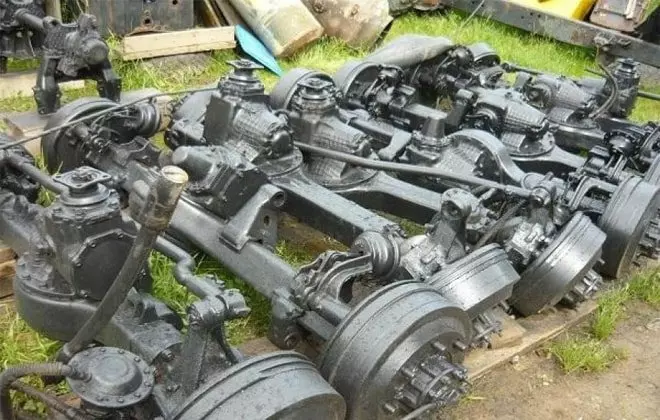 Центральная и задняя оси имеют оригинальную конструкцию, картеры главной трансмиссии смонтированы на верхней части картера балки. Детали скрепляются болтами, стык герметизируется специальной прокладкой. По этой причине сиденья передней оси не взаимозаменяемы с задними.