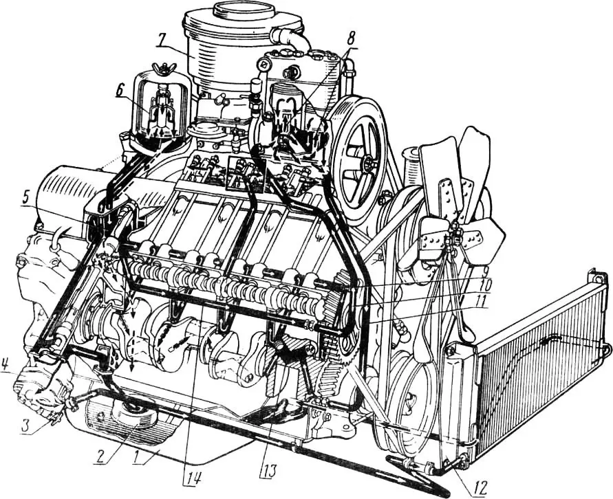Работа системы смазки следующая. Верхняя часть масляного насоса подает масло через канал в задней перегородке агрегата к фильтру. Очищенное масло поступает в распределительную камеру, расположенную в задней переборке блока, откуда поступает в два основных продольных канала — из левого канала оно подается к коренным подшипникам коленчатого вала, а от них — к подшипникам и упорному фланцу распредвала. Он течет по каналам коленчатого вала к шатунным подшипникам. В корпусе шатуна имеется отверстие, в момент совмещения которого с каналом в шейке коленчатого вала масло разбрызгивается на стенку цилиндра. Через два радиальных отверстия в центральном опорном пальце распределительного вала масло периодически подается по каналам в блоке цилиндров, головках блоков, стойках, валах коромысел к втулкам коромысел и через отверстия в коромыслах к верхним наконечникам аукционов. Толкатели смазываются маслом из основных продольных каналов.