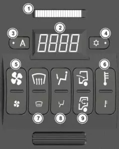 - Включение — нижней половиной кнопки 9 установите поток свежего воздуха ниже 30%. Режим полной рециркуляции: нижняя половина клавиши 9 установлена в минимальное состояние.
